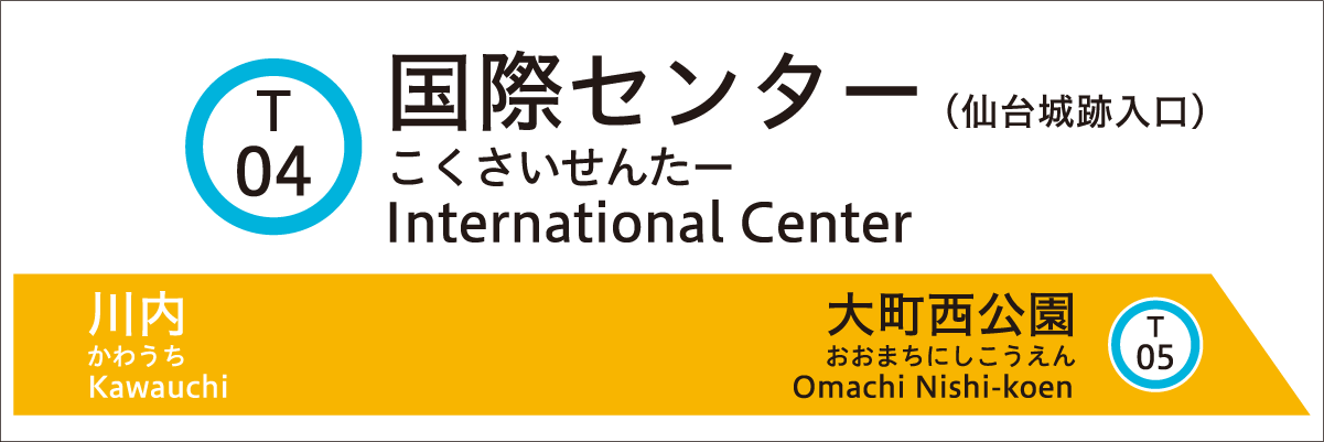 例えば、2015年(平成27年)12月開業の仙台市地下鉄・東西線の「八木山動物公園」駅の場合は「ライン(路線)カラー」の円にアルファベット頭文字の「路線記号」と二桁の「駅番号」でデザインしています。